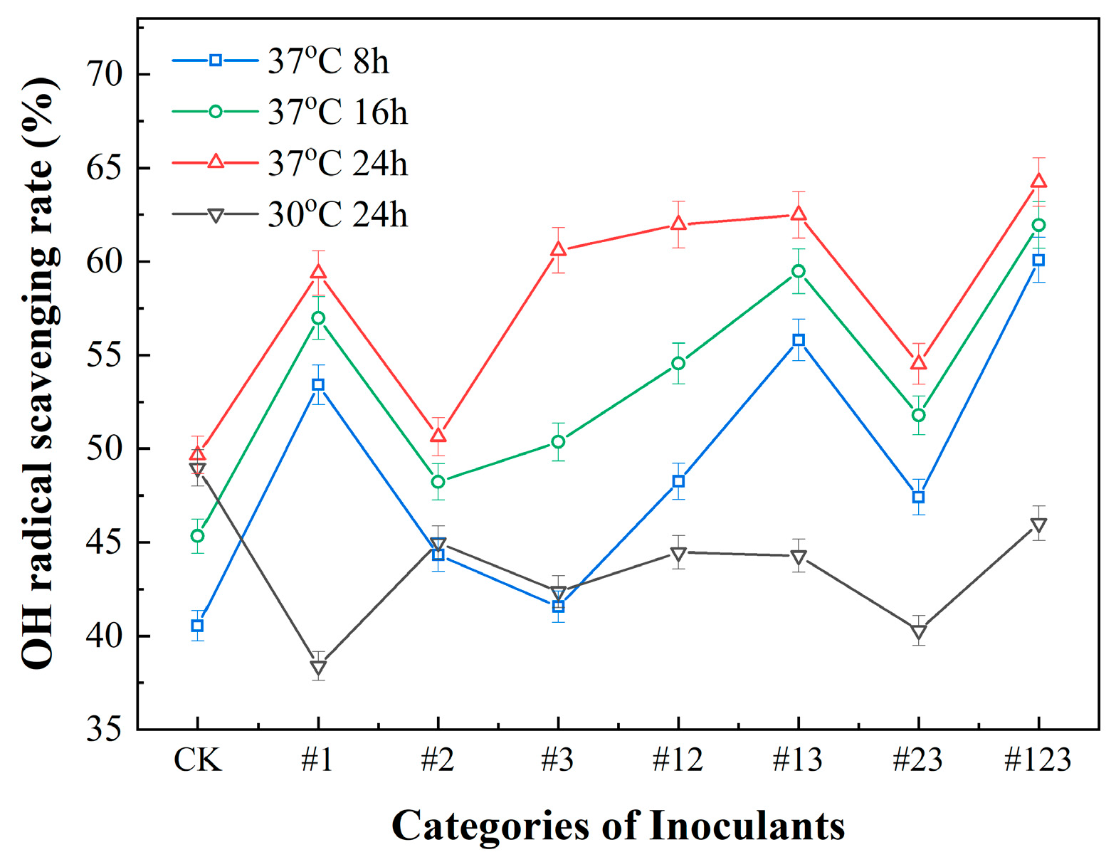 3.3.2. •OH Scavenging Capacity of Suaeda Tea Inoculated with Different Microbial Agents