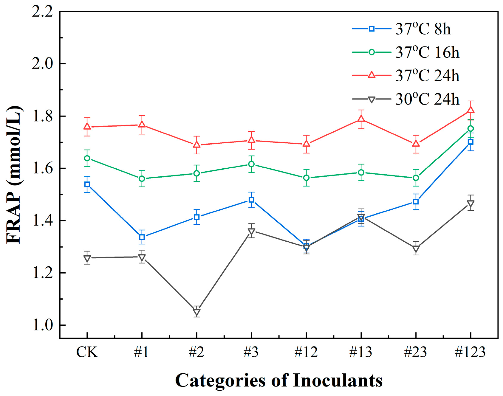 3.3.3. FRAP Scavenging Capacity Inoculated with Different Microbial Agents