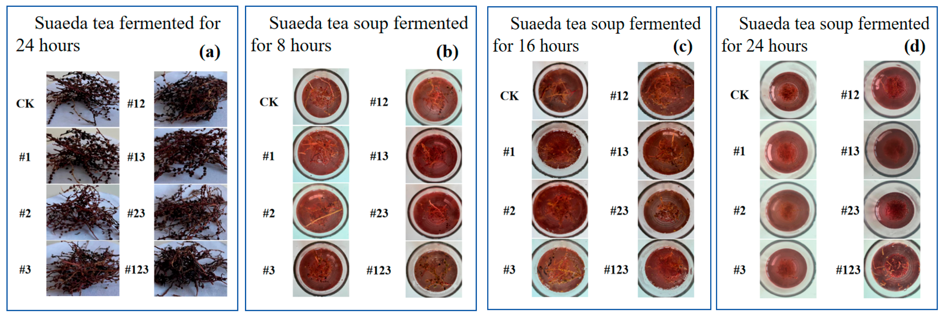 3.1. The pH of Fermented Suaeda Tea Inoculated with Different Microbial Agents