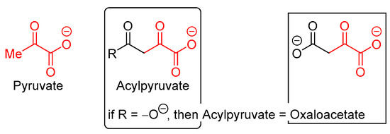 Structures of pyruvate, oxaloacetate, and acylpyruvate.