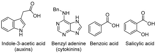 The search for effective chemical stimulants to enhance microalgal productivity has led to the investigation of diverse compound classes. Among the most studied are phytohormones, such as auxins and cytokinins (Figure 2), which have been shown to influence cell division and biomass yield in Chlorella cultures [25,27]. Similarly, simple organic acids like benzoic and salicylic acid (Figure 2) have been identified as signaling molecules that can improve cell growth [31].