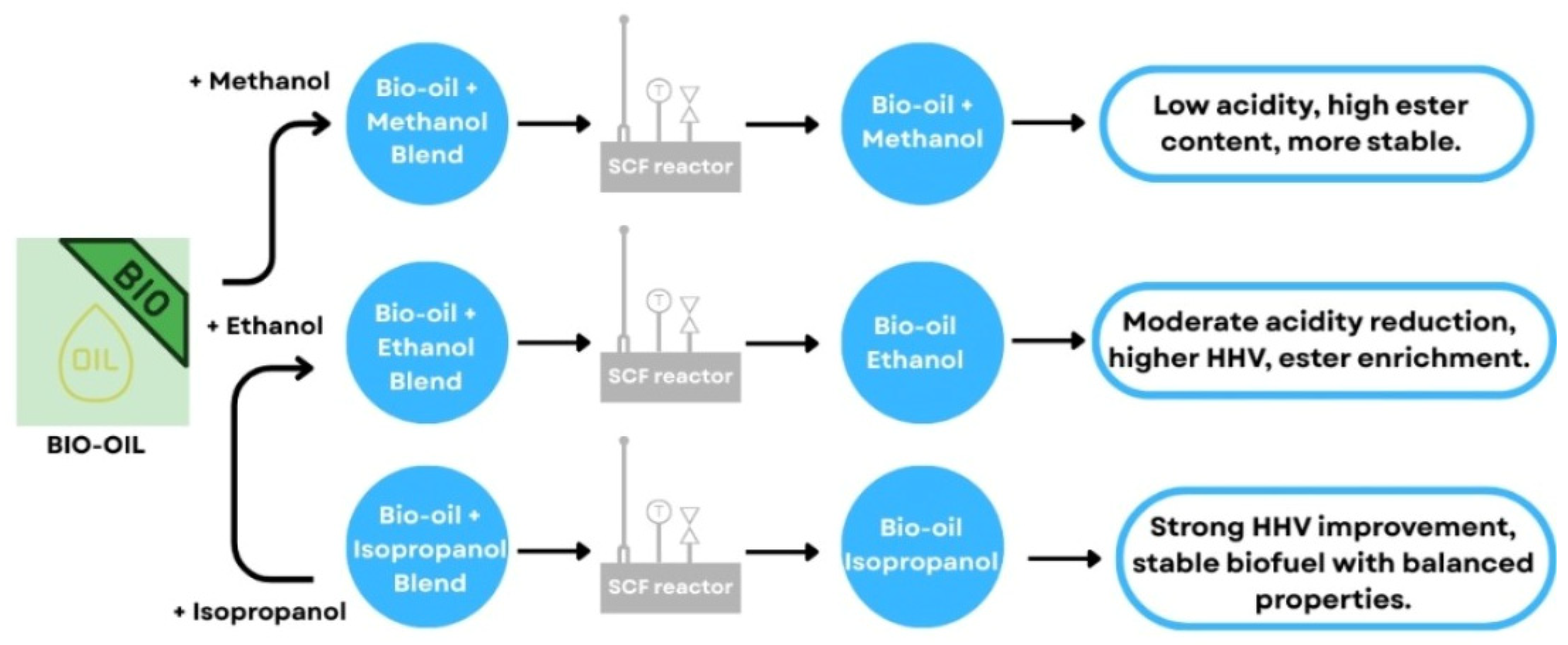 | Supercritical alcohol blending | Algal bio-oil | Improved stability and HHV | Reduced acidity; higher HHV | [8,83,84] |