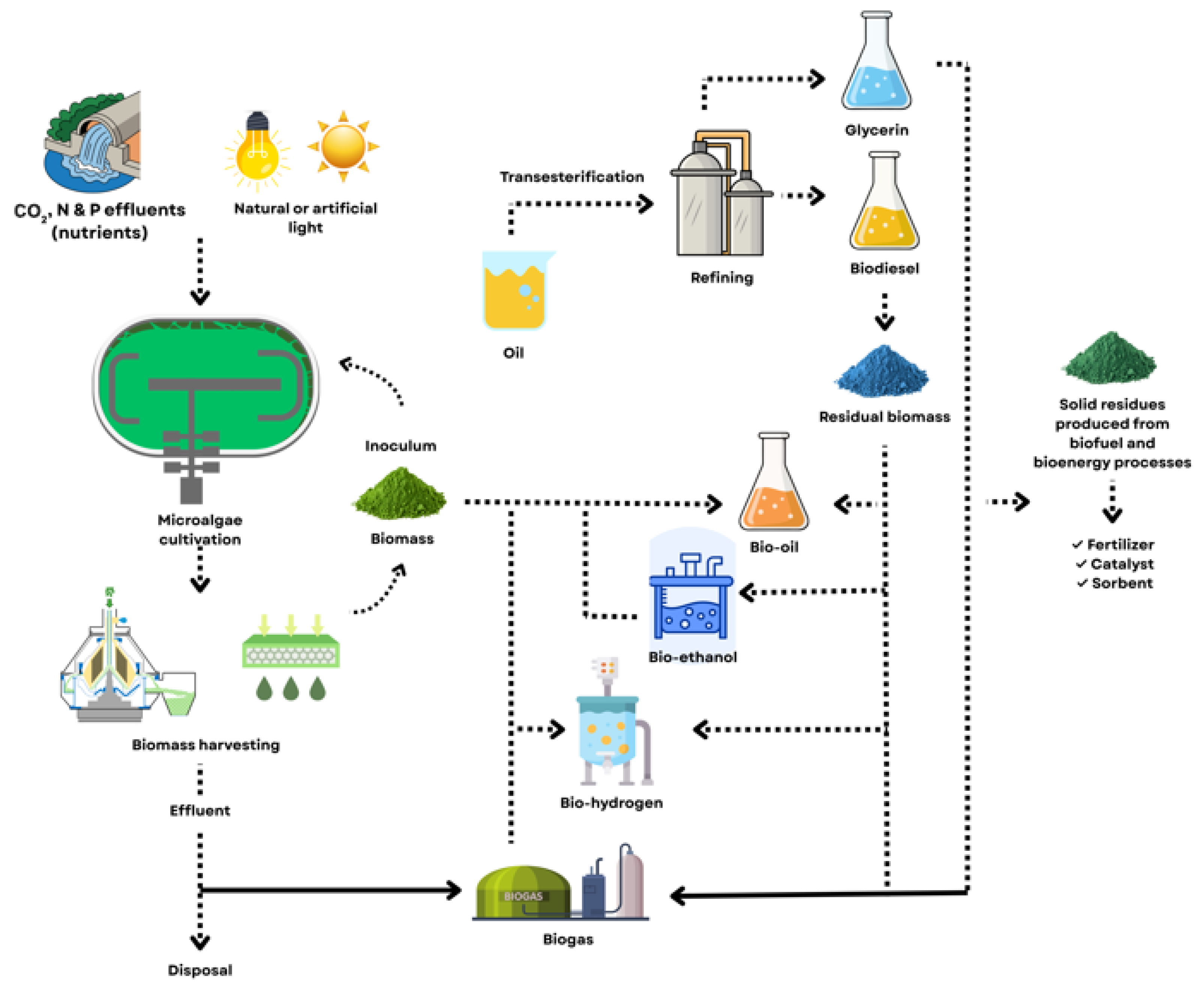 - Arun, J.; Gopinath, K.P.; Sundar Rajan, P.; Felix, V.; Joselyn Monica, M.; Malolan, R. A Conceptual Review on Microalgae Biorefinery through Thermochemical and Biological Pathways: Bio-Circular Approach on Carbon Capture and Wastewater Treatment. Bioresour. Technol. Rep. 2020, 11, 100477. [Google Scholar] [CrossRef]