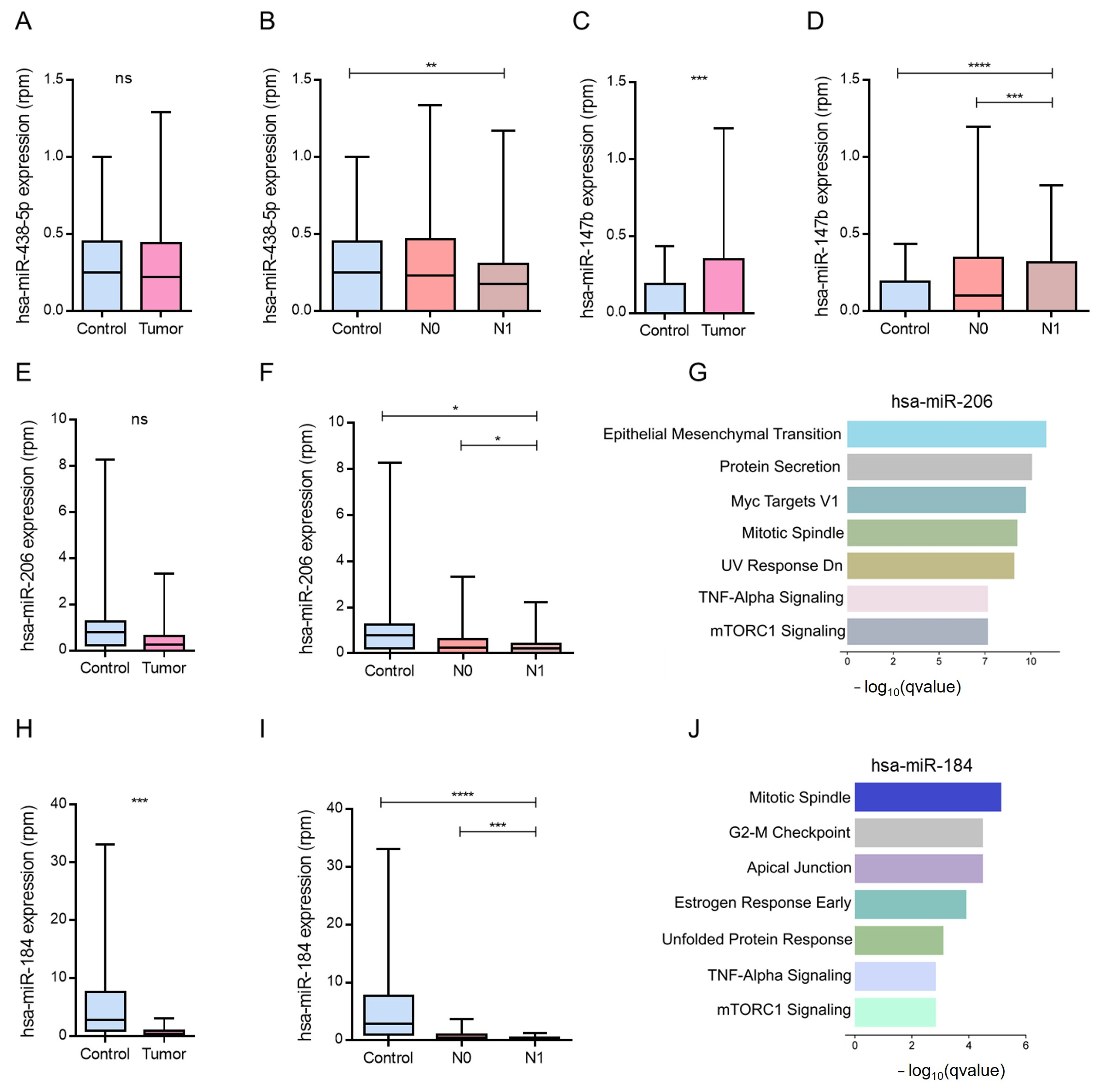 Figure 3H,I). Similarly, hsa-miR-206, which was reduced in metastatic samples, showed significantly lower expression in N1 than in N0 (
