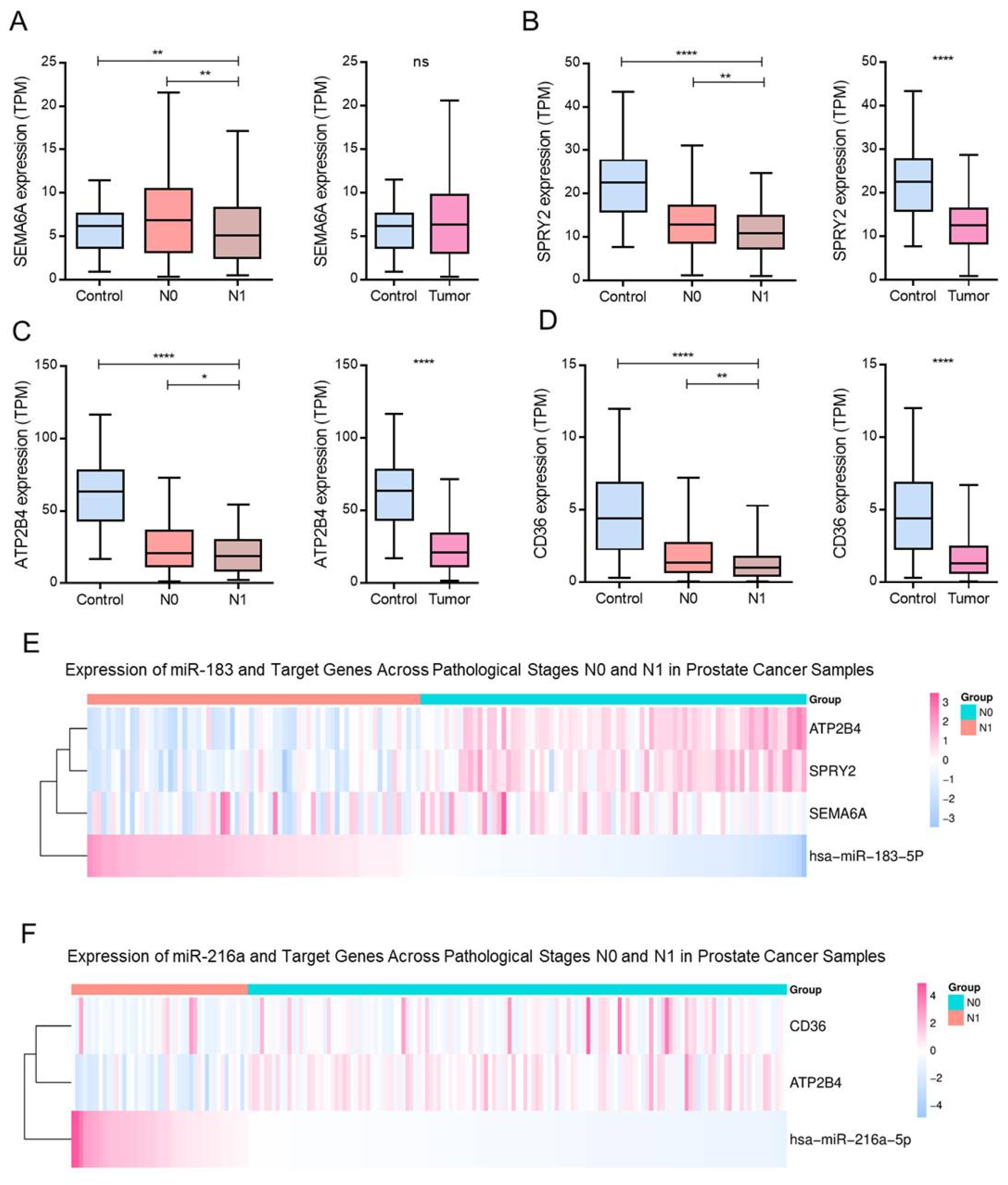 Using TCGA-PRAD expression and clinical data, we evaluated the levels of four miRNAs previously predicted to inhibit antiangiogenic genes: hsa-miR-137, hsa-miR-129-2-3p, hsa-miR-183-5p, and hsa-miR-216a-5p. Expression was compared between normal and tumor samples, as well as across nodal metastasis stages (non-metastatic, N0 vs. metastatic, N1). hsa-miR-137 did not show significant expression differences between tumor and control samples or between N0 and N1 stages (