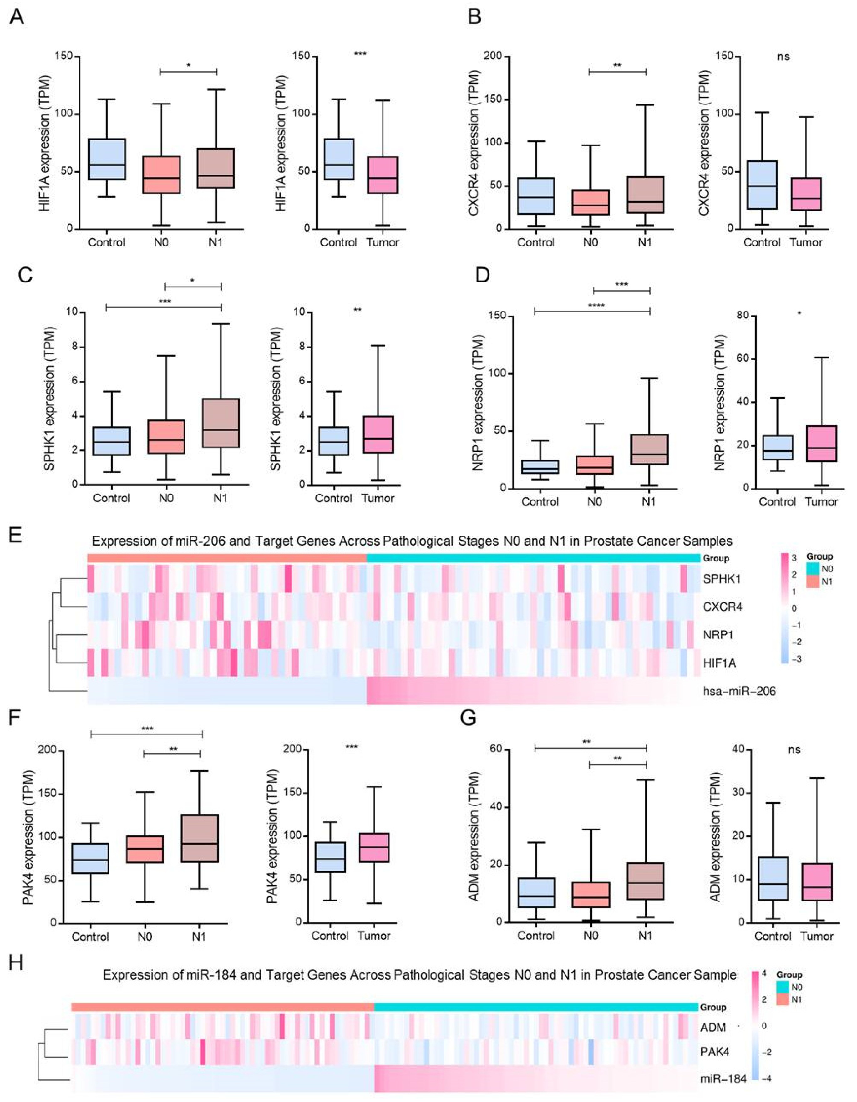 Our findings show that early stage PCa (N0) is characterized by elevated levels of the tumor-suppressive miRNAs miR-206, miR-1-3p, miR-143-3p, and miR-145-5p, which target VEGFA, EGFR, SPHK1, and HIF1A [