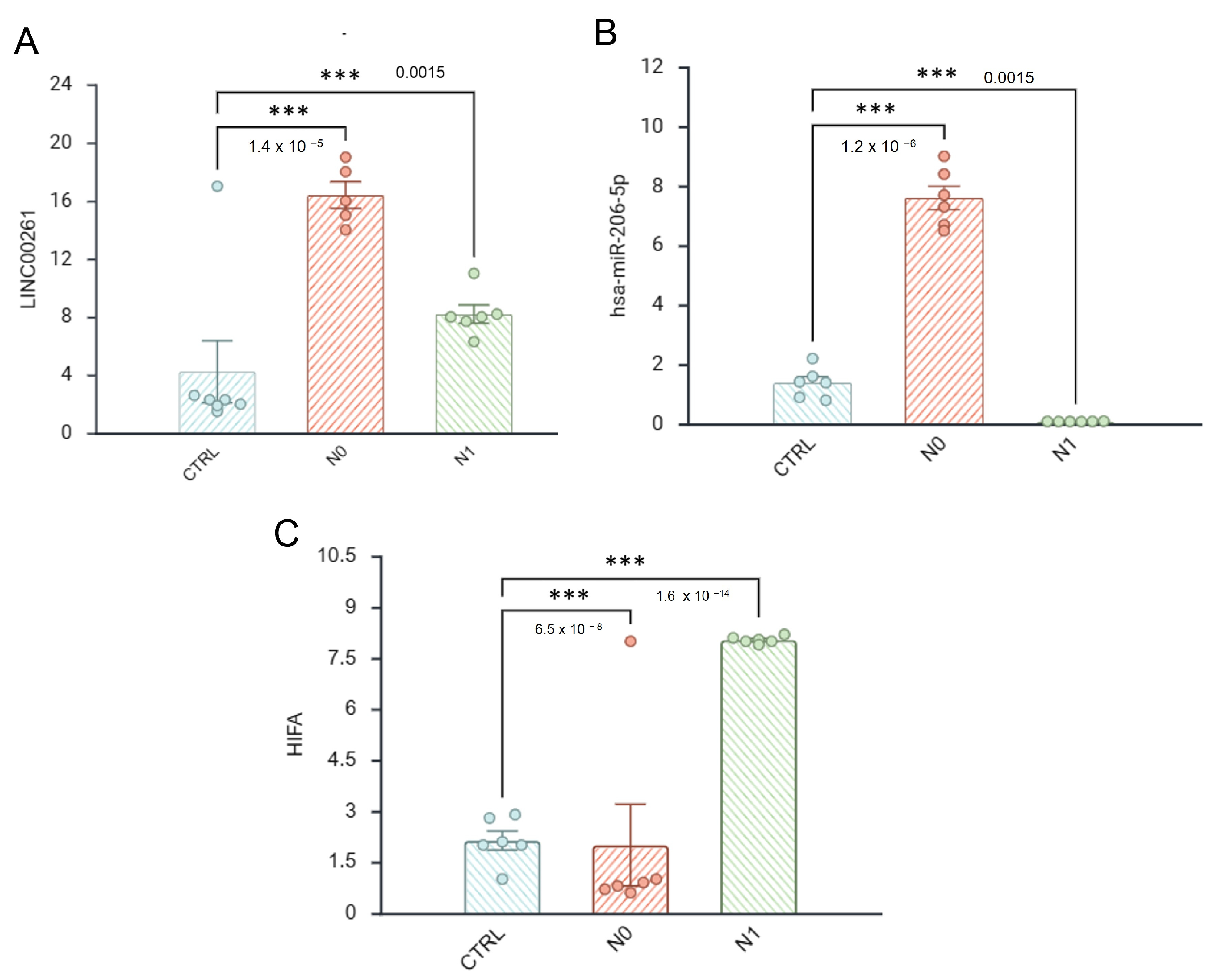 Figure 7A). Interestingly, LINC00261 expression was higher in N0 than in controls. Consistent with the transcriptomic model, miR-206 was significantly repressed in N1 samples (ΔΔCt = +3.5 vs. N0; fold change = 0.088,