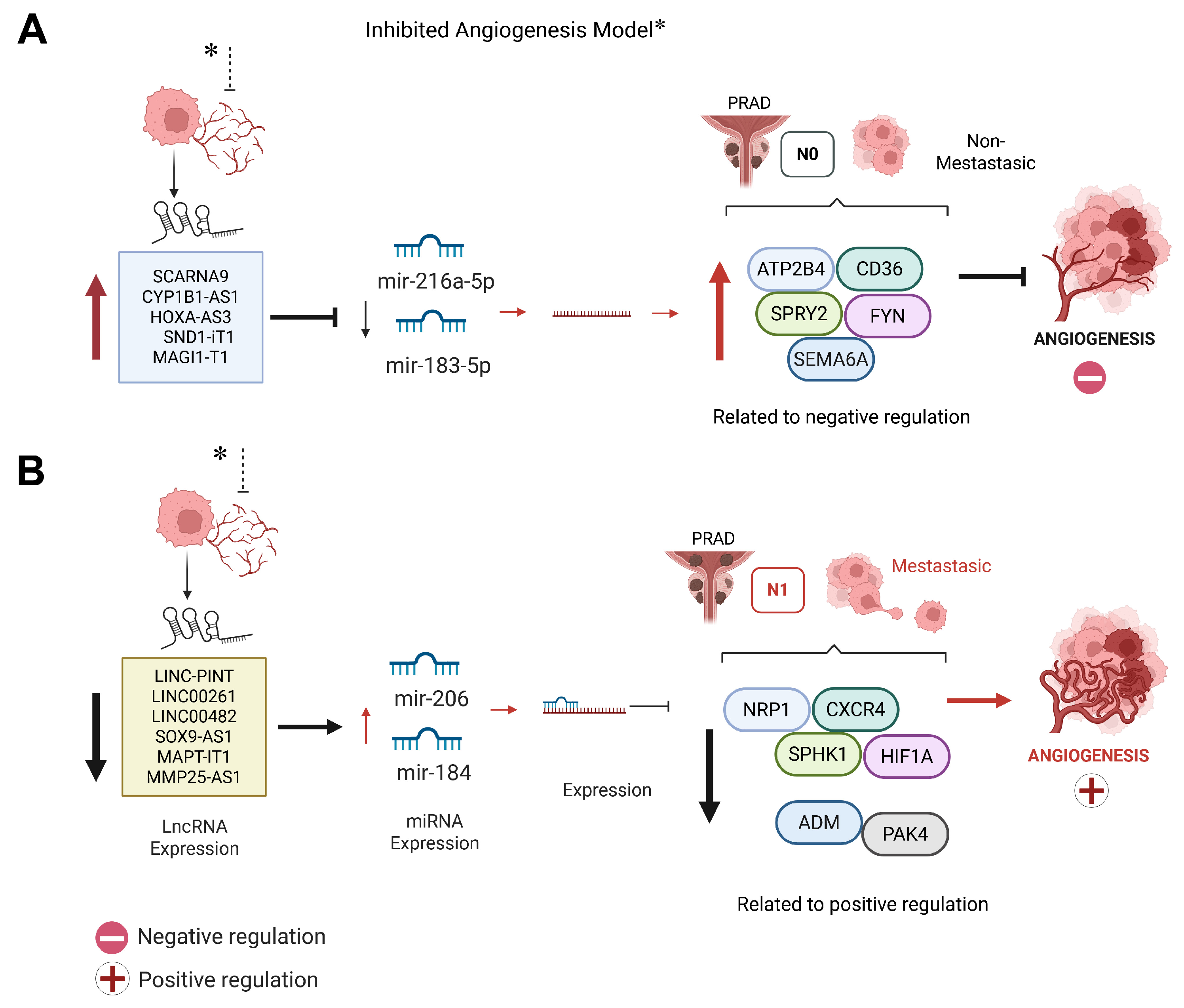 In this network, higher miR-206 and miR-184 levels in N0 samples were accompanied by lower expression of several pro-angiogenic genes, including
