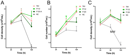 Viable cell counts of HEK293-6E cells from 24 to 120 hpt in three independent experiments (N = 3, biological replicates). Each biological replicate (A–C) was performed in triplicate technical replicates (n = 3), with two cell counts averaged for each sample at each time point.