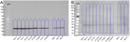 (A) Example of quantification of expressed protein. The Western blot was developed with an anti-His-tag Alexa488 fluorescent antibody. Three technical replicates of each hydrolysate are denoted as i, ii, and iii, while NC is the negative control. The band appeared around the expected size of 30–32 kDa. (B) Stain-free blot image used for total lane protein normalisation.
