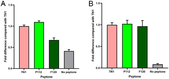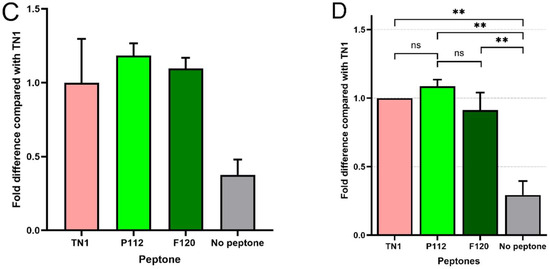 All data were analysed using GraphPad Prism (version 8.0.2, GraphPad Software). The average of the calculated fold-difference values of protein expression of 3 technical replicates of TN1, P112, F112, or no hydrolysate control from 3 independent biological repeats was taken. Data were analysed with one-way ANOVA and Tukey’s multiple comparison test.