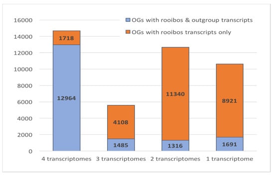 Distribution of rooibos-specific and general plant orthologous groups (OGs) across the transcriptomes.
