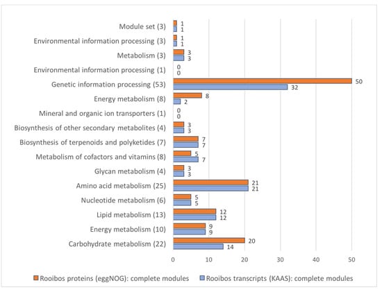 The K-numbers provided by KAAS and eggNOG were used to link the transcripts and proteins to KEGG modules. Currently, the KEGG database contains 171 plant-specific modules (PSMs). When combining all rooibos data, 150 PSMs were annotated to completion (120 by KAAS and 148 using eggNOG; Figure 3). When compared to eggNOG, KAAS failed to complete annotation of six carbohydrate metabolism, six energy metabolism, and 18 genetic information processing modules, but completed annotation of two modules associated with metabolism of cofactors and vitamins that were annotated incompletely by eggNOG. Both annotation procedures missed the same six plant-specific modules. Four of these have only been annotated in algae (M00338 M00185 M00616 M00741) and one is specific to monocotyledonous plants (M00369). A major signature module that appears to be missing in both annotation sets of the rooibos transcriptomes was the biosynthetic pathway for “Oxygenic photosynthesis in plants and cyanobacteria” (M00611). This pathway is present in 39% of the plant species currently stored in the KEGG database, including model organisms such as A. thaliana and O. sativa as well as in legumes, such as Glycine max, L. japonicas, and Phaseolus vulgaris.