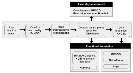 - Grabherr, M.G.; Haas, B.J.; Yassour, M.; Levin, J.Z.; Thompson, D.A.; Amit, I.; Adiconis, X.; Fan, L.; Raychowdhuru, R.; Zeng, Q.; et al. Full-Length Transcriptome Assembly from RNA-Seq Data without a Reference Genome. Nat. Biotechnol. 2011, 29, 644–652. [Google Scholar] [CrossRef]