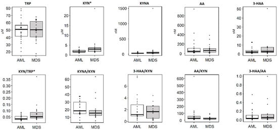 Differences in the concentrations of tryptophan (TRP) metabolites between acute myeloid leukemia (AML) and myelodysplastic syndrome (MDS) patients. Serum TRP and TRP metabolites, such as kynurenine, 3-hydroxyanthranilic acid, kynurenic acid, and anthranilic acid, in samples from AML patients (n = 25) and MDS patients (n = 19) were analyzed using high-performance liquid chromatography. Statistical analysis was performed using a Welch’s t-test. The middle line in the box indicates median and the bound indicates 25% quartile and 75% quartile. * p < 0.05. 3-HAA: 3-hydroxyanthranilic acid, AA: anthranilic acid, AML: acute myeloid leukemia, KYN: kynurenine, KYNA: kynurenic acid, MDS: myelodysplastic syndrome, TRP: tryptophan.