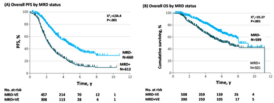 Kaplan-Meier curves for progression free survival (PFS) (A) and overall survival (OS) (B) comparing minimal residual disease (MRD)-negative versus MRD-positive myeloma patients. Data were adjusted to account for the different proportions of patients in each study being MRD-positive and MRD-negative. Reproduced with permission from Munshi et al. [4] Association of Minimal Residual Disease with Superior Survival Outcomes in Patients with Multiple Myeloma: A Meta-analysis. Copyright 2017 American Medical Association. All rights reserved.