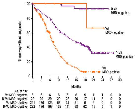 - Paiva, B.; Chandia, M.; Puig, N.; Vidriales, M.B.; Perez, J.J.; Lopez-Corral, L.; Ocio, E.M.; Garcia-Sanz, R.; Gutierrez, N.C.; Jimenez-Ubieto, A.; et al. The prognostic value of multiparameter flow cytometry minimal residual disease assessment in relapsed multiple myeloma. Haematologica 2015, 100, e53–e55. [Google Scholar] [CrossRef][Green Version]
