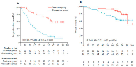 (A) Progression free survival. (B) Overall survival from the point of progression to myeloma. Copyright 2020 with the permission from Elsevier. Reprinted from Mateos et al. [23]. Lenalidomide plus dexamethasone versus observation in patients with high-risk smouldering multiple myeloma (QuiRedex): long-term follow-up of a randomised, controlled, phase 3 trial.