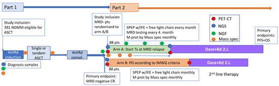 Preliminary results from the ongoing phase III study (CANDOR trial) of carfilzomib, dexamethasone, and daratumumab (DKd) vs. carfilzomib and dexamethasone (Kd), including 466 RRMM patients, has demonstrated a significant benefit in terms of PFS for the Dara and Kd group, where median PFS was not reached vs. 15.8 months in the Kd group (HR, 0.63; CI, 0.46–0.85; p = 0.0014). Importantly, Dara and Kd was also significantly beneficial in the lenalidomide exposed/refractory groups, with a median PFS not reached vs. 12.1 months in the lenalidomide exposed group (HR, 0.52; 95% CI, 0.34–0.80) and median PFS not reached vs. 11.1 months in the lenalidomide refractory group (HR, 0.45%; 95% CI, 0.28–0.74) [38]. Weekly dosing of carfilzomib 20/70 mg/m2 has been demonstrated to be safe in combination with daratumumab [37] and to significantly increase PFS (11.2 months vs. 7.6 months) compared to twice weekly in combination with dexamethasone [39]. Based on these results, Dara and Kd was chosen as the most appropriate regimen for relapse treatment in this study. The primary objectives of the phase III study are to demonstrate the benefit of initiating 2.L treatment at loss of MRD negativity compared to initiating 2.L treatment at progressive disease according to IMWG criteria. Secondary objectives are to determine the time from randomization to start of 3.L treatment time to next treatment, to determine the rate of MRD negativity during 2.L treatment, to evaluate how starting treatment early vs. late impacts HRQOL, and to evaluate safety. Exploratory objectives include comparing depth of response between NGS and Euroflow NGF, exploring the correspondence between PET-CT results and MRD dynamics (Euroflow NGF, NGS) by intra-patient comparison, and comparing bone marrow MRD negativity with QIP-MS.