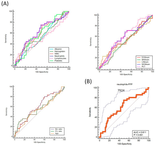 Erythrocyte sedimentation rate (ESR, mm/hr), albumin (g/L), ferritin (ng/mL), hemoglobin (g/dL), white blood-cell count (WBC, 109/L), neutrophils (109/L), eosinophils (109/L), basophils (109/L), lymphocytes (109/L), monocytes (109/L), platelets (109/L), neutrophil/lymphocyte ratio (N/L), and platelet/lymphocyte ratio (P/L) were subjected to a preliminary ROC curve analysis. Comparison of ROC curves using hematological/laboratory data identified candidate predictors for PD/R (Figure 1A). Under the curves (AUC), the ROC area resulted from 123 samples, except for ESR, ferritin, eosinophils, basophils, and monocytes resulting from 89 patients (data missing in 34 patients). Among the 14 variables tested, neutrophils showed the highest AUC value (0.611, Table 2). The ROC curve for neutrophils evaluated the “best” cutoff value that maximized the risk of PD/R at 7.924 cells/mm3 (Figure 1B); we used the round-up value to 8 × 109/L in the subsequent analyses.