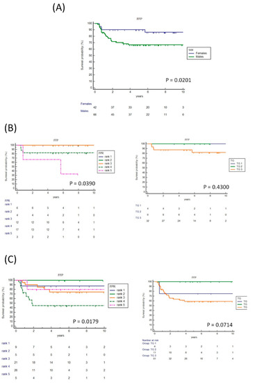 (A) Kaplan–Meier curves for FFP NScHL compared by sex (n = 108, AIEOP LH-2004 protocol. (B) Kaplan–Meier curves for FFP in females with NScHL (n = 42, AIEOP LH-2004 protocol) comparing FPR and TG models. (C) Kaplan–Meier curves for FFP in males (n = 66, AIEOP LH-2004 protocol) comparing FPR and TG models. FPR, the final prognostic rank model performed from Cox analysis with covariates (TG 3, HLA-G C/A, neutrophils > 8 × 109/L); the point values for each rank are reported in the results section TG, therapeutic group criteria, are those used today by clinicians to choose the most appropriate treatment option. The detailed criteria used are reported in the introduction and methods sections).