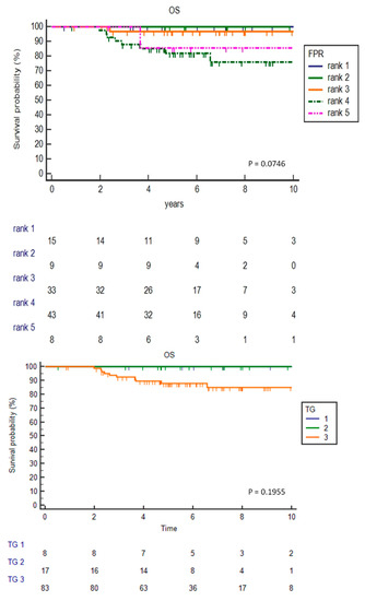 3.6. Comparative FPR and TG Kaplan–Meier Curves for OS