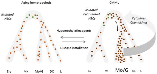 - Itzykson, R.; Kosmider, O.; Renneville, A.; Morabito, M.; Preudhomme, C.; Berthon, C.; Adès, L.; Fenaux, P.; Platzbecker, U.; Gagey, O.; et al. Clonal architecture of chronic myelomonocytic leukemias. Blood 2013, 121, 2186–2198. [Google Scholar] [CrossRef] [PubMed]