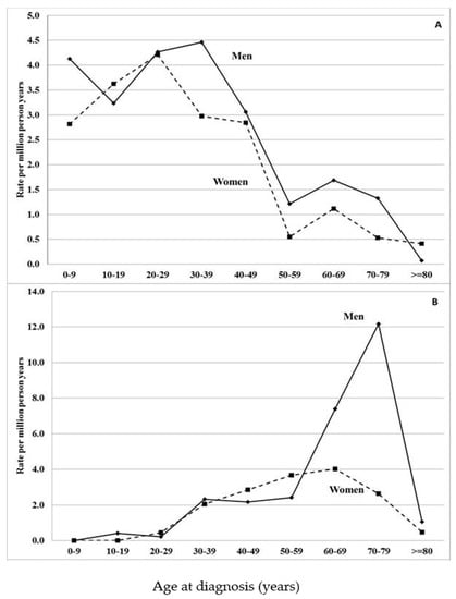 Age-specific incidence rates (per million person–years) for amyloidosis subtypes in Sweden (1997–2008), (A) ‘non-neuropathic heredofamilial amyloidosis’ or autoinflammatory disease (E85.0) and (B) ATTRv amyloidosis (familial amyloidotic polyneuropathy, E85.1). Modified from reference [16].