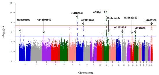 Manhattan plot on meta-analysis of the 1230 AL-amyloidosis cases and 7589 regionally matched controls. SNP IDs (rs numbers) are shown for 10 SNPs, in peaks with p-value below 10−5. The x-axis shows the chromosomal position and the y-axis is the significance (–log10 p; 2-tailed) of association derived by logistic regression. The red horizontal line represents the genome-wide significance thresholds of p = 5.0 × 10−8 and the blue horizontal line represents the suggestive significance thresholds of p = 1.0 × 10−5. From reference [26] with permission.