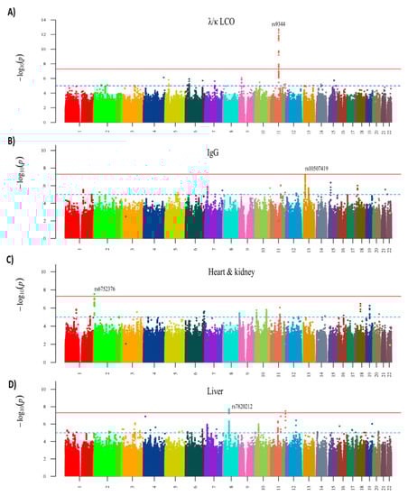 Manhattan plots of association analysis for AL amyloidosis clinical profiles with genome-wide significant results. (A) λ/κ LCO profile; (B) IgG profile; (C) heart and kidney profile; (D) liver profile. The x-axis shows the chromosomal position and the y-axis is the significance (–log10 P; 2-tailed) of association derived by logistic regression. The red line shows the genome-wide significance level (5 × 10−8) and the blue line shows a suggestive significance level (1 × 10−5). The top SNP of each significant association is labeled. From reference [30] with permission.