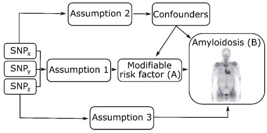 Principles of Mendelian randomization analyses and assumptions that need to be satisfied for unbiased analyses. Assumption 1 indicates genetic variants used as instrumental variables (i.e., SNPs) are only associated with the modifiable risk factor. Assumption 2 indicates genetic variants are not associated with any measured or unmeasured confounders. Assumption 3 indicates genetic variants only influence the risk of developing AL amyloidosis through the modifiable risk factor. Courtesy of Charlie Saunders.