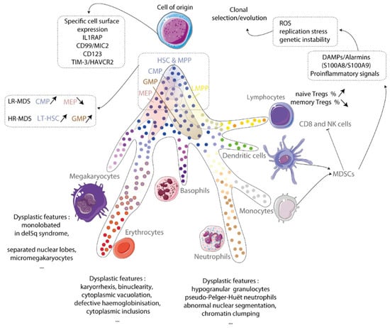HSCs are immunophenotypically and functionally defined as Lin−/lo CD34+CD38− CD90+CD45RA− cells able to produce myeloid progenitors in vitro and reconstitute hematopoiesis in immunocompromised mice [3,4,5]. Recent works showed that MDS arise from a population of rare MDS cells identified by the presence of recurrent deletions or mutations, sharing these phenotypic features, engrafting into mice bone marrow in which clonal myeloid cells are predominant over lymphoid cells, demonstrating a myeloid-biased HSC [3,4,5,6]. MDS HSCs persist and expand under conventional therapies, therefore contributing to disease progression. Immunophenotyping of long-term (LT)-HSCs (Lin−CD34+CD38−CD90+), short-term HSCs (Lin−CD34+CD38−CD90−), common myeloid progenitor (CMP: Lin−CD34+CD38+CD123+CD45RA−), megakaryocyte erythroid progenitor (MEP: Lin−CD34+CD38+CD123−CD45RA−) and granulocyte monocyte progenitor (GMP: Lin−CD34+CD38+CD123+CD45RA+) compartments demonstrates quantitative anomalies with CMP expansion and MEP reduction in LR-MDS correlated with anemia and thrombocytopenia and LT-HSC and GMP expansion in HR-MDS [3,4,5,6,7]. While the pattern of mutations in the dominant HSC subclone is transmitted to its myeloid progeny, it may differ between CMP, GMP and MEP compartments depending on the functional impact of a given mutation on granulomonocytic or erythroid development [6,7].