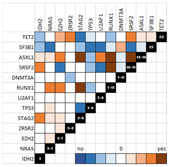 Schematic representation of mutations in MDS. Co-occurring mutations are shown in brown and mutually exclusive mutations are shown in blue. The power of linkage or exclusion is indicated by the color gradient.