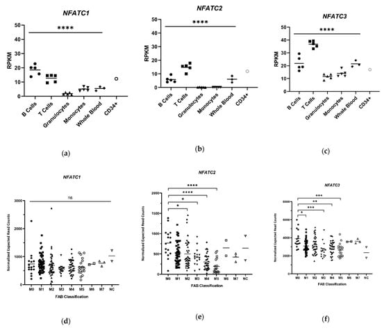 AML cells are characteristically poorly differentiated [42] and it is worth considering whether NFAT could have a role in maintaining the stem cell-like properties of blasts, given the observed gene expression profiles in healthy myeloid tissue. RNA-seq data for NFAT expression were extracted from the TCGA dataset of 173 adults with de novo AML [40] (Figure 3d–f). These were categorised according to the French–American–British (FAB) classification based on AML blast morphology [43], which gives a broad understanding of the differentiation status of blasts (classification described in Appendix A). These data show that poorly differentiated myeloid leukaemia, particularly in type M0, have a significantly higher expression of NFATC2 and NFATC3 than more differentiated forms of AML. In contrast NFATC1 expression appears consistent regardless of FAB subtype. It could be hypothesised that NFATC2 and/or NFATC3 negatively regulate differentiation pathways in AML and so warrant further investigation to determine the mechanism(s).