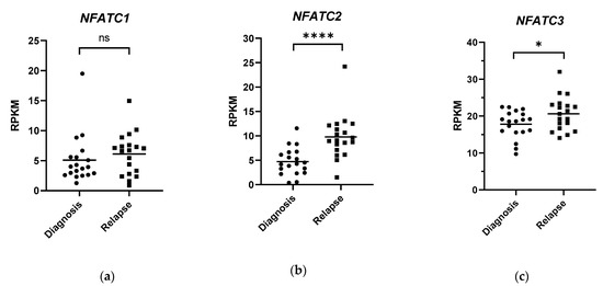 Resistance to therapy, be it FLT3 inhibitors or otherwise, is a common cause of relapse in AML [61], with evidence so far focusing on TKIs and FLT3ITD AML. To investigate whether NFAT might be important in AML relapse following chemotherapy, RNA-seq data were extracted from the GSE83533 dataset, which is derived from paired patient samples (n = 19) at diagnosis and at relapse. All patients were initially treated with combination chemotherapy, in some cases followed by stem cell transplantation [62]. The expression of NFATC2 and NFATC3 was significantly higher in relapse samples, while NFATC1 expression was unchanged (Figure 5). As these were paired samples, this suggests there could be outgrowth of NFATC2/3high chemo-resistant clone(s) following initial therapy, or that NFATc2/3-driven signalling is recruited secondary to acquired resistance mechanisms.