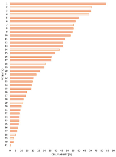 The variation in spontaneous stress-induced AML cell apoptosis between patients. Primary AML cells were derived from 41 consecutive patients. The cells were separated/enriched, cryopreserved, and stored frozen in liquid nitrogen until they were thawed and cultured in vitro for 48 h before the percentages of viable-early apoptotic-late apoptotic/necrotic cells were determined by flow cytometry. The figure presents the percentage of viable AML cells (x-axis) derived from 41 individual patients (y-axis, patient number/identity) at the end of the culture period. The median viability for all 41 patients was 23.0% (range 0.5–83.6%). The results are presented as the percentage of viable cells. The 32 patients included in the proteomic studies (see Section 3.2, Section 3.3, Section 3.4 and Section 3.5) are indicated by dark color and based on the median viability level in this analysis of overall viability data including 41 patients; we used 25% viable cells as the cut-off between high and low viability patients.