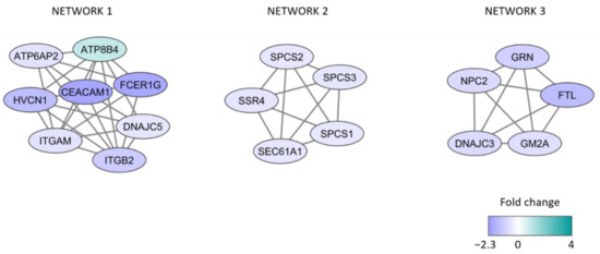 - A majority of the proteins are endoplasmic reticulum proteins (ATP6AP2, ATP8B4, SSR4, DNAJC3, ITGM, ITGB2, SPCS1/2/3, SEC61A1, GRN, NPC2, GM2A).