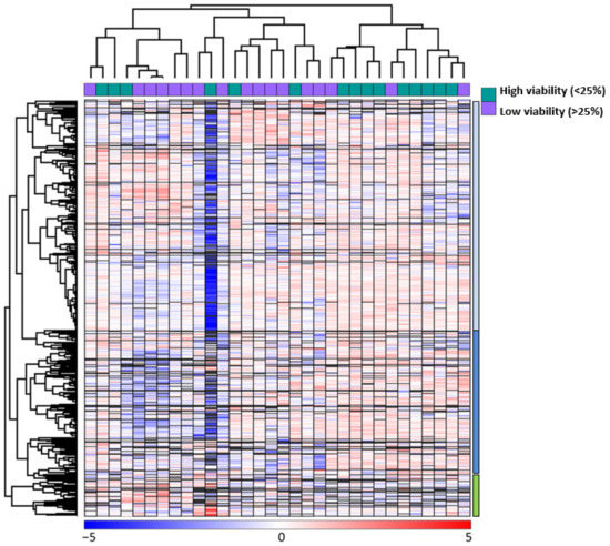 Proteomic studies were performed for 32 patients. Based on the overall results, we defined 25% viable cells at the cut-off point between high and low viability (Figure 1, Table S1). According to this definition, 15 patients were classified as high viability patients and 17 patients were classified as showing low viability. We quantified a total of 7902 proteins; more than 6500 proteins could be quantified for the large majority of patients, and the number of quantified proteins did not differ significantly between the two groups (Table S1).