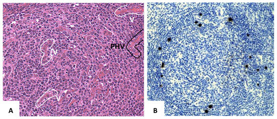 KSHV/HHV8-associated MCD. (A) There is a marked intrafollicular vascular proliferation (V). The lymphoid follicle also has typical penetrating hyalinised vessels (PHV). (B) In the follicular mantle, some large atypical cells, consistent with plasmablasts, are positive for KSHV/HHV8 viral IL-6. Magnification ×20 (A,B).