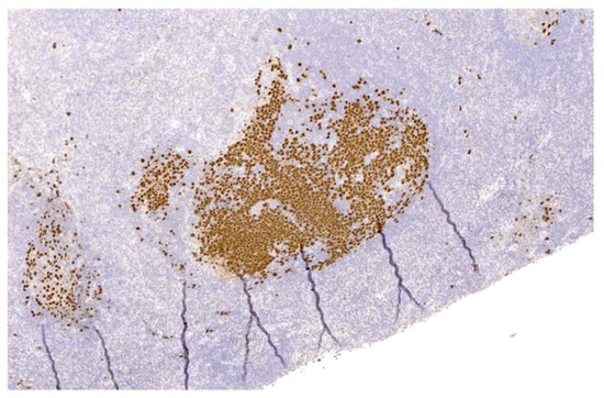 Germinotropic lymphoproliferative disorder. Immunohistochemical stain for KSHV/HHV8-encoded LANA shows co-infection of KSHV/HHV8 in the plasmablasts, within the involved germinal centres.