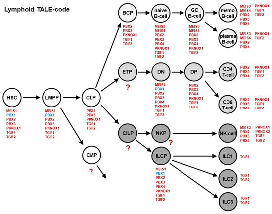The lymphoid TALE-code describes the activities for TALE homeobox genes (red) in stages and cell types of early hematopoiesis and lymphopoiesis, including developing B-cells, T-cells, NK-cells, and ILCs. TALE homeobox gene PBX1 is highlighted in blue. BCP: B-cell progenitor; CILP: Common innate lymphoid cell progenitor; CLP: Common lymphoid progenitor; CMP: Common myeloid progenitor; DN: Double negative thymocytes; DP: Double positive thymocytes; ETP: Early T-cell progenitor; GC: Germinal center; HSC: Hematopoietic stem cell; ILC: Innate lymphoid cells; LMPP: Lymphoid and myeloid primed progenitor; memo: Memory; NKP: NK-cell progenitor; ?: Cell types with unknown TALE gene activities.