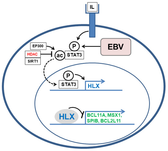 This diagram shows the regulation and function of aberrantly expressed NKL homeobox gene HLX. STAT3 is activated by interleukin (IL)-receptor-signaling or EBV-infection resulting in phosphorylation (P). The subcellular localization of STAT3 is regulated by acetylation (ac). EP300 mediates acetylation, while SIRT1 and overexpressed histone deacetylases (HDACs, red) perform deacetylation. Phosphorylated and deacetylated STAT3 translocate into the nucleus (dashed arrow) to activate its target gene HLX. HLX can in turn operate as a repressor to inhibit the target genes BCL11A, MSX1, SPIB, and BCL2L11 (green).