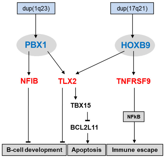 Screening for deregulated TALE homeobox genes in HL patients revealed seven class members, including PBX1 [31]. The HL cell line SUP-HD1 expressed elevated PBX1 levels and served as a model to analyze upstream and downstream factors of this TALE homeobox gene. Genomic analysis demonstrated a copy number gain for PBX1 at 1q23 in SUP-HD1, which may underlie its upregulation. Target gene analysis revealed that PBX1 activated the differentiation factor NFIB and NKL homeobox gene TLX2. Of note, aberrant overexpression of NFIB in addition to NFIA, NFIC, and NFIX may indicate that this family of developmental TFs plays a substantial role in the pathogenesis of HL [31].