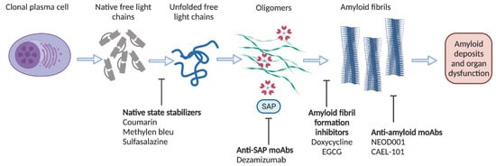 Anti-amyloid targeted therapeutic approaches for AL amyloidosis. Created with BioRender.com (accessed on 10 November 2021).