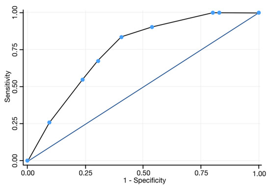 The AUC corresponding to the ROC analysis for the multivariate model was 0.75 (Figure 1). The optimal cut-off level in the aforementioned score was equal to −1.18. The rate of poor response or resistance to the treatment at 3 months was 37.7% in patients with score ≥ −1.18 and 7.4% in patients with score < −1.18. The sensitivity and specificity of the score was 83.9% and 59.4%, respectively. According to the Hosmer–Lemeshow test, a value of p = 0.597 showed that the model was well calibrated.