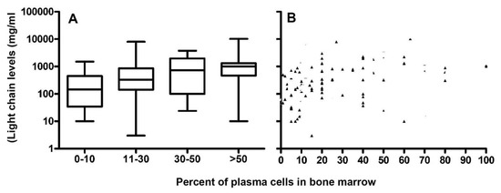 AL patients’ plasma cell content within the bone marrow in correlation to the serum free light chain levels at diagnosis. (A). Bar plot correlating plasma cells percentage clustered (10%< and >50% p = 0.001). (B). Dot plot correlating plasma cells percentage with free light chain levels (Pearson r = 0.225. p = 0.07).