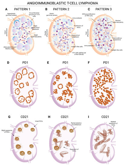 Morphologic patterns of AITL. Pattern 1: (A) intact architecture, hyperplastic germinal centers, attenuated/absent mantle zones, slight paracortical expansion, and slight proliferation of high endothelial venules; (D) circumferential perifollicular PD1-positive TFH cells with only occasional clustering around vessels; (G) intact CD21+ FDC meshworks with only slight expansion into the paracortex. Pattern 2: (B) Partial effacement of architecture, proliferation of HEVs, and paracortical expansion by a polymorphous infiltrate with atypical clear cells, small lymphocytes, plasma cells, macrophages, eosinophils, frequent immunoblasts, and rare Hodgkin/Reed–Sternberg-like cells; (E) increase in PD1-positive TFH cells extending out of the follicle into the paracortex with accumulation around the HEVs; (H) CD21+ FDC meshworks start expanding and encircling the HEVs. Pattern 3: (C) Total effacement of architecture, polymorphous infiltration with diffuse neoplastic clear-appearing T-cells, small lymphocytes, macrophages, plasma cells, eosinophils, immunoblasts, and scattered Hodgkin’s-/Reed–Sternberg-like cells. Marked proliferation of HEVs is seen with neoplastic clear-appearing T-cells clustered around them; (F) PD1-positive neoplastic T-cells are diffusely present; (I) CD21+ FDC meshworks are markedly expanded and encircle the blood vessels. Image created in Biorender by M.M.