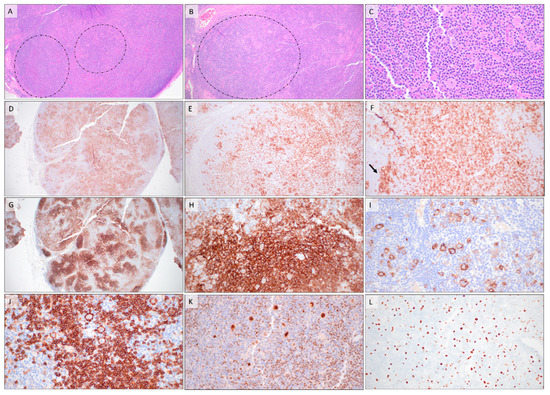 By morphology, two distinct growth patterns are recognized: a follicular growth pattern that mimics B-cell follicular lymphoma (FL-like) and a progressive transformation of a germinal centers-like pattern (PTGC-like) (Figure 6) [18]. In cases with the FL-like pattern, the neoplastic T-cells are arranged in well-defined nodules that lack the morphological features of normal follicles. Mantle zones can either be preserved or absent. In PTGC-like cases, representing the majority of FTCL, the neoplastic T-cells are seen in small aggregates surrounded by small mantle zone B-cells arranged in large, irregular nodules. Eosinophilic infiltration is uncommon, and unlike in AITL, arborizing high endothelial venules and expanded follicular dendritic cell meshworks are not identified. The neoplastic T-cells range from small to medium with irregular nuclei, coarse to vesicular chromatin, and moderate to abundant pale cytoplasm. While the nuclear features can resemble centrocytes or centroblasts, the pale cytoplasm is a useful distinguishing feature. Scattered B-cell immunoblasts, including some resembling Hodgkin’s/Reed–Sternberg cells, usually surrounded by neoplastic T-cells, are seen in a significant subset of cases.