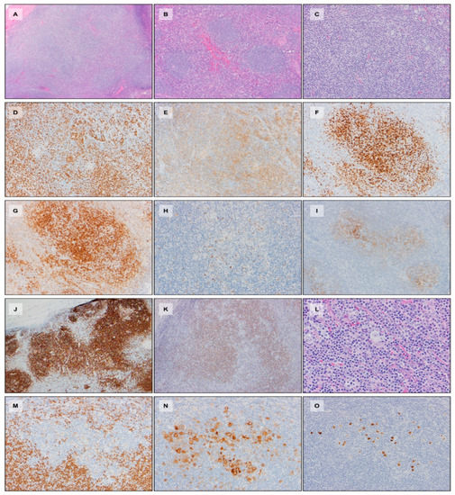 - Rodriguez-Pinilla, S.M.; Atienza, L.; Murillo, C.; Perez-Rodriguez, A.; Montes-Moreno, S.; Roncador, G.; Perez-Seoane, C.; Dominguez, P.; Camacho, F.I.; Piris, M.A. Peripheral t-cell lymphoma with follicular t-cell markers. Am. J. Surg. Pathol. 2008, 32, 1787–1799. [Google Scholar] [CrossRef]