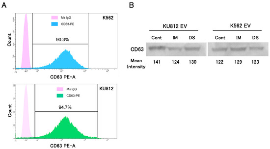 The purification and quantification of EV from the supernatant of cell cultures. (A) The purity of EVs was confirmed by surface CD63 antigen of EV by flowcytometric analysis. The upper histogram is the EVs from the K562 cell, and the lower histogram is EVs from KU812 cells. (B) EVs from each cell line were quantified by western blotting. The mean intensity of each band was measured by ImageJ software. (IM: imatinib, DS: dasatinib).